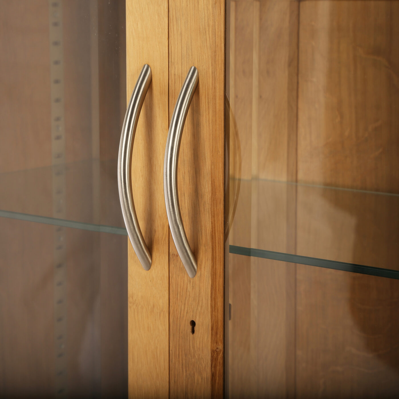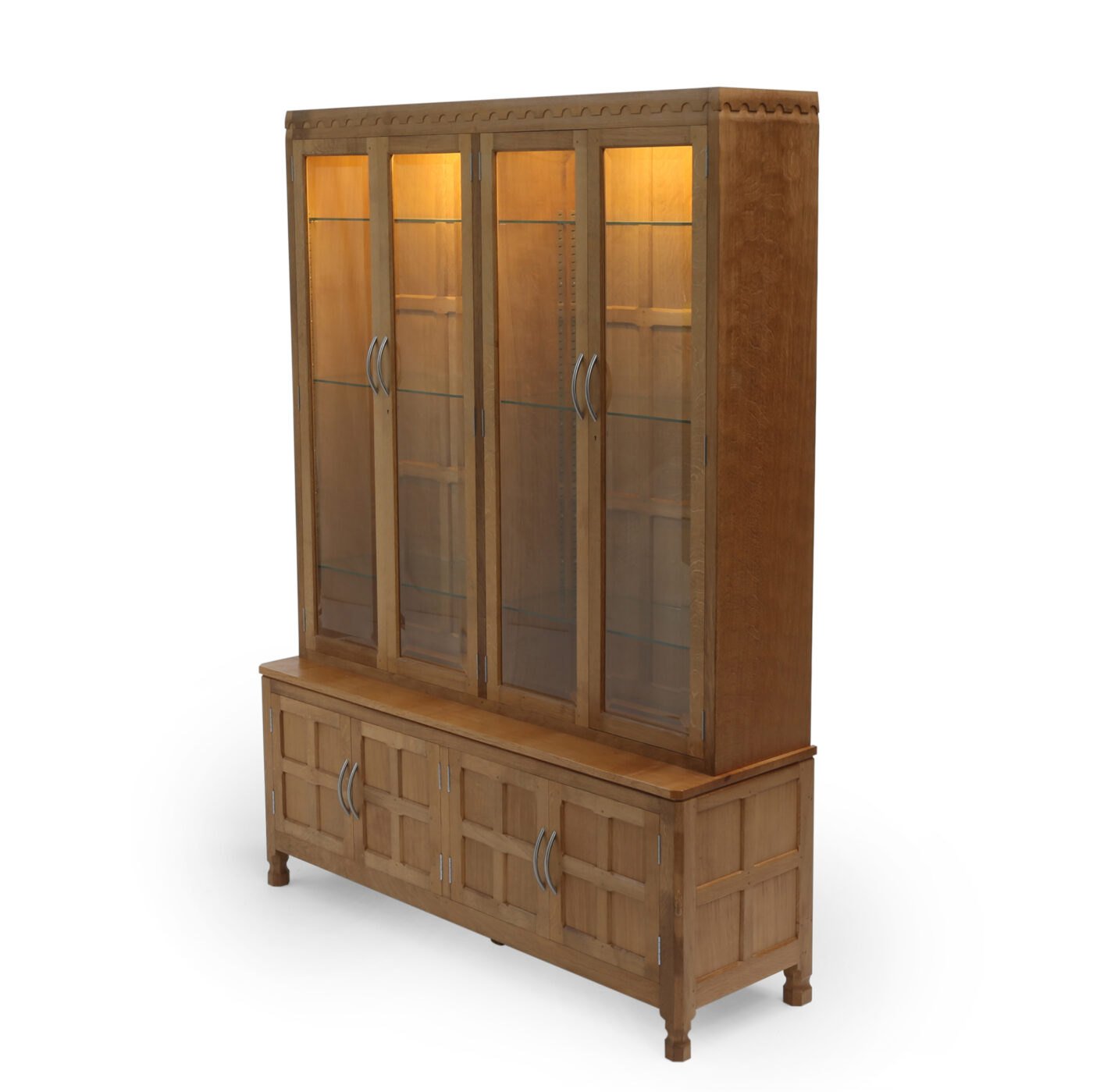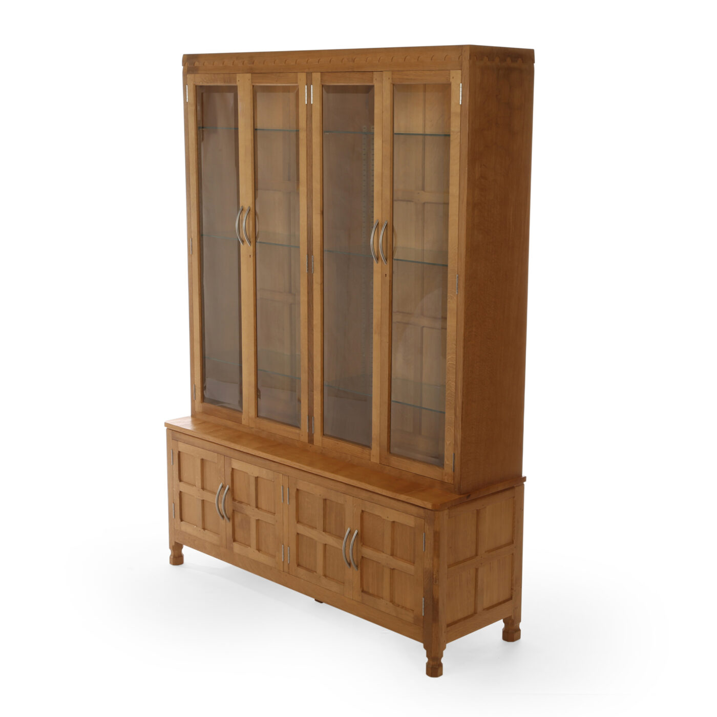 This is a glazed pair of display cupboards with eight fully adjustable glass shelves over a pair of double panelled English oak cupboards raised on octagonal legs. This stunning piece gives you lots of room to display your china, glass and other precious items.