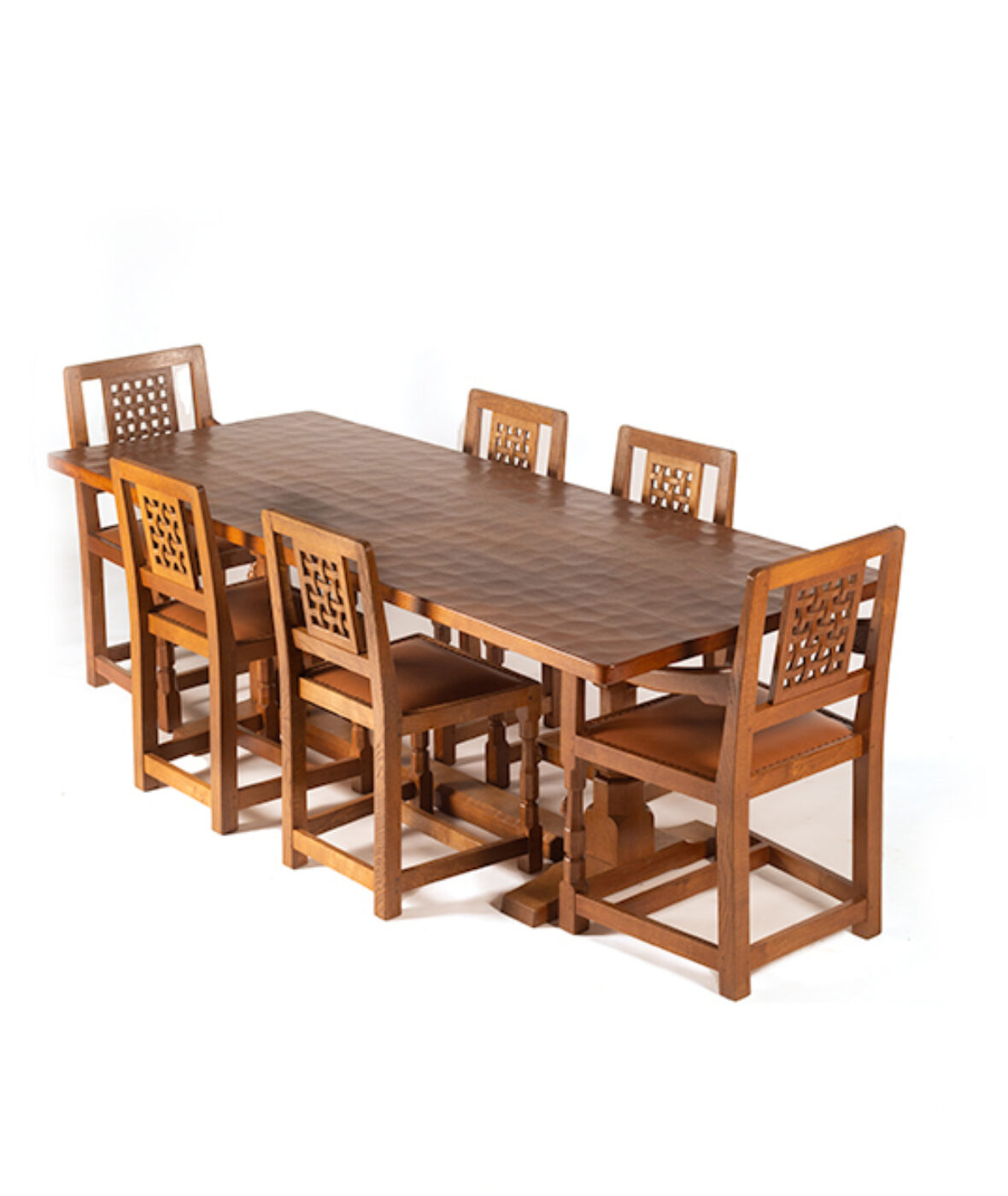 This 7'0"Refectory dining table has a hand adzed rectangular top supported by two octagonal legs,one with carved mouse and four Lattice back Dining Chairs & two Lattice back Arm Chairs , upholstered in new Capri tan cow hide leather. (Photograph is not of actual Table & chairs for sale.Please call for details)