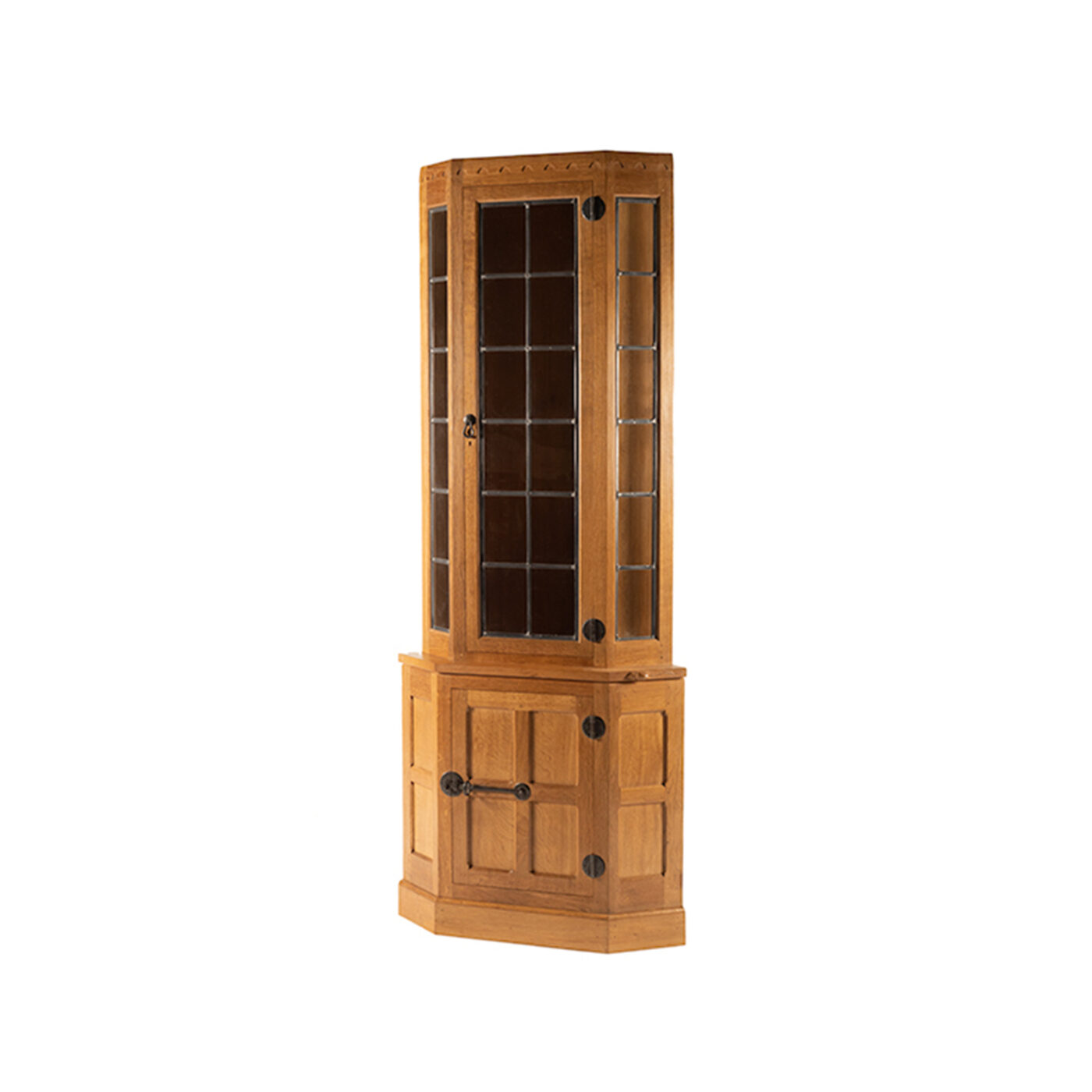 This Corner Display cupboard has a leaded glazed top with three internal fixed glass shelves,over a panelled cupboard with one internal fixed Oak shelf.There is a fitted plinth around the base unit at floor level. (Photograph is not of actual corner cupboard for sale.Please call for details)