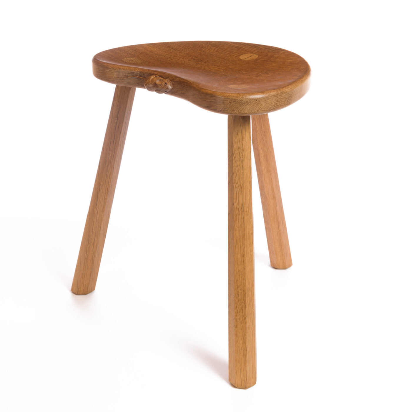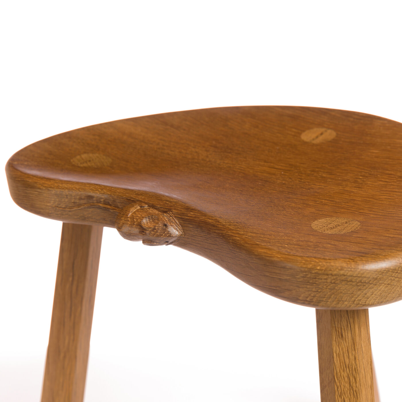 This stool has a kidney shaped adzed top, with signature Mouse and is raised on three tapered octagonal legs. This stool can be used as an extra seat at the Dining Table if required. * The image shown is for reference only. As each piece is handmade using natural materials, variations in grain and appearance are to be expected and make every item unique.