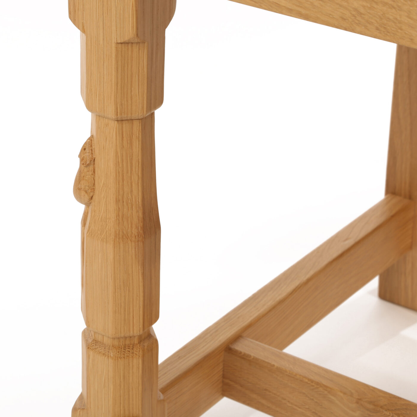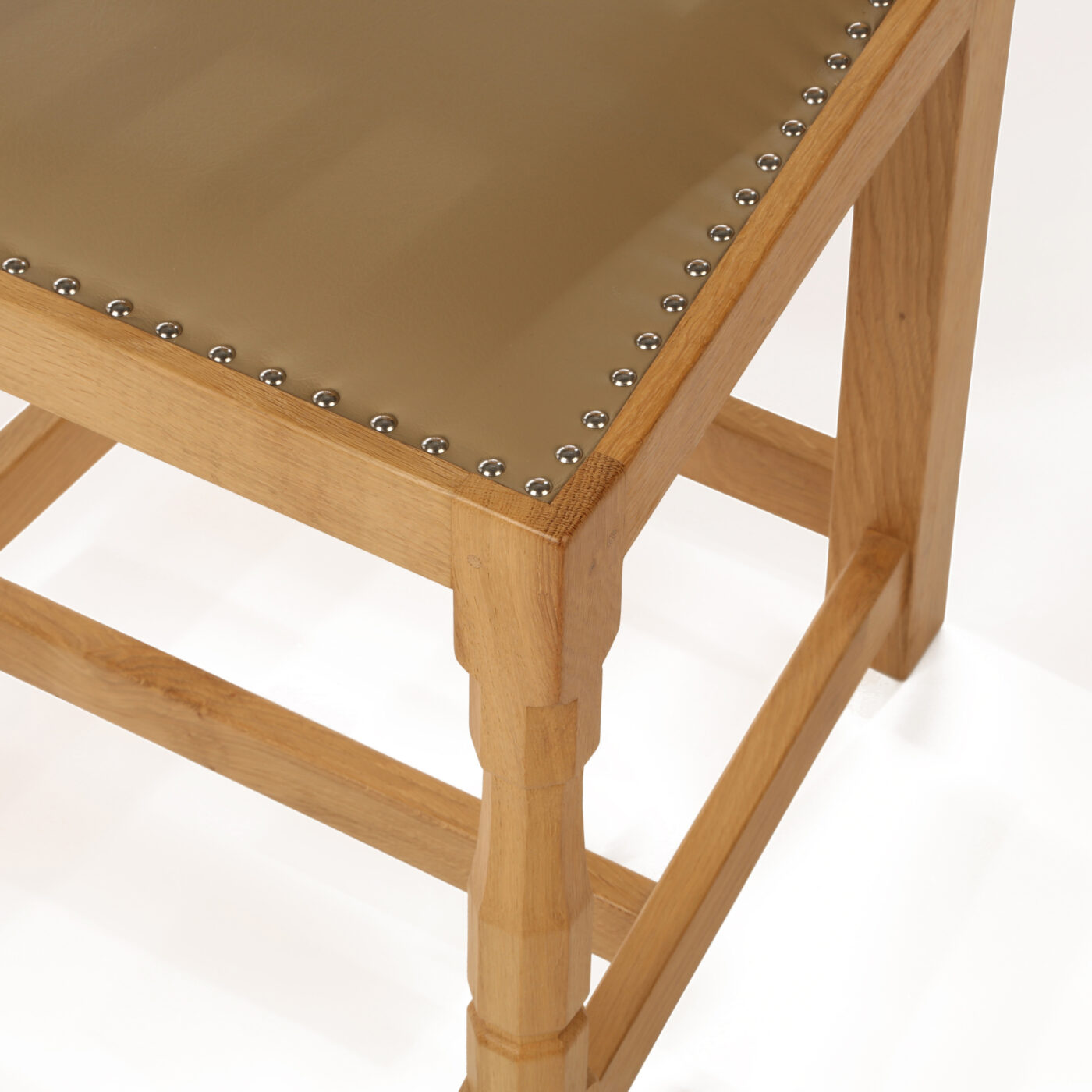 This tall dining chair has a slightly curved back with four vertical slats and octagonal front legs with a flame retardant foam seat covered with cow hide and fixed with a choice of antique brass or chrome upholstery tacks.
