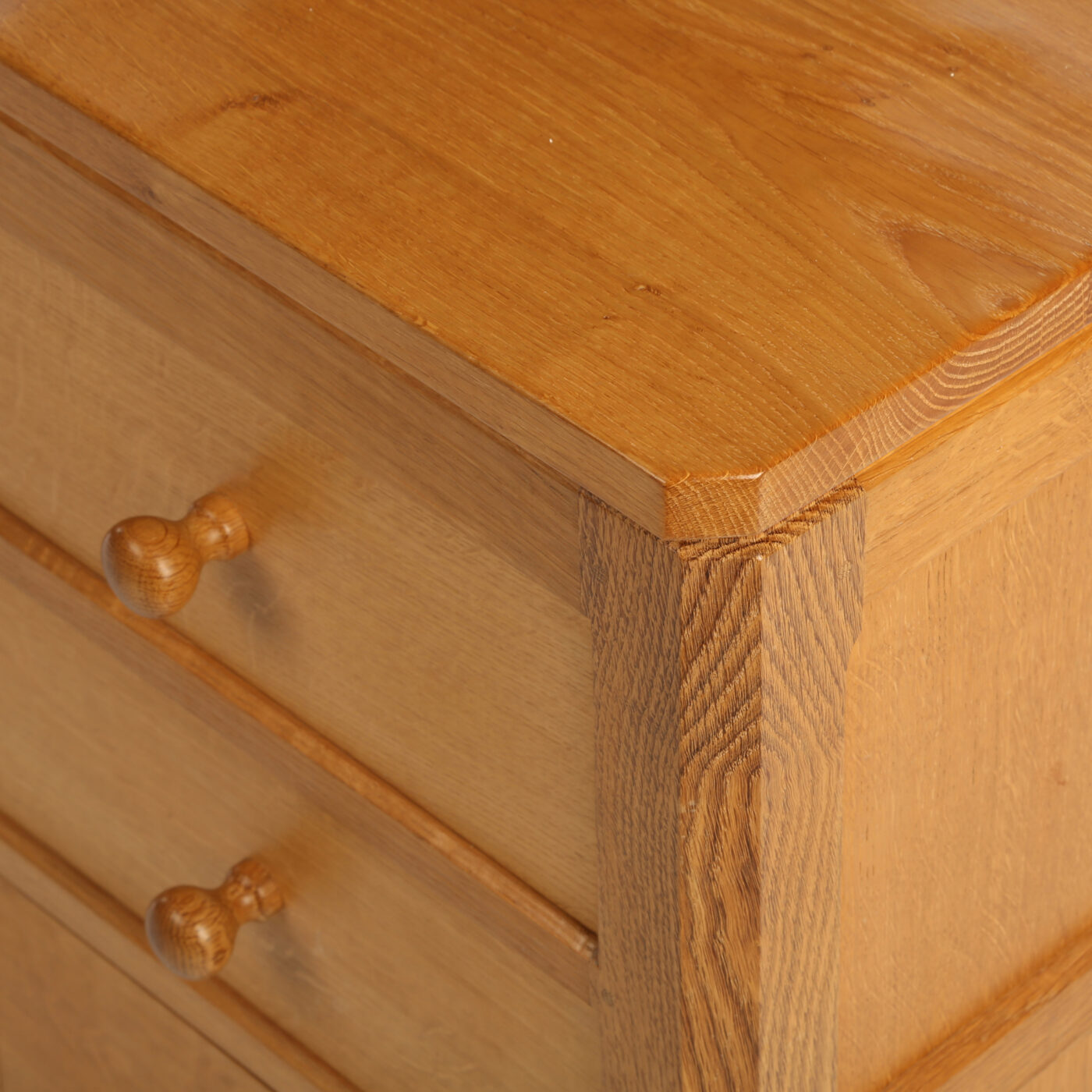 This rectangular-shaped dressing table has a hand adzed top with raised upstand at the rear and a central single pivoting mirror. The kneehole area is panelled and has three graduated drawers to either side with octagonal legs on each side. This is a beautiful oak dressing table to sit at and make yourself look beautiful.