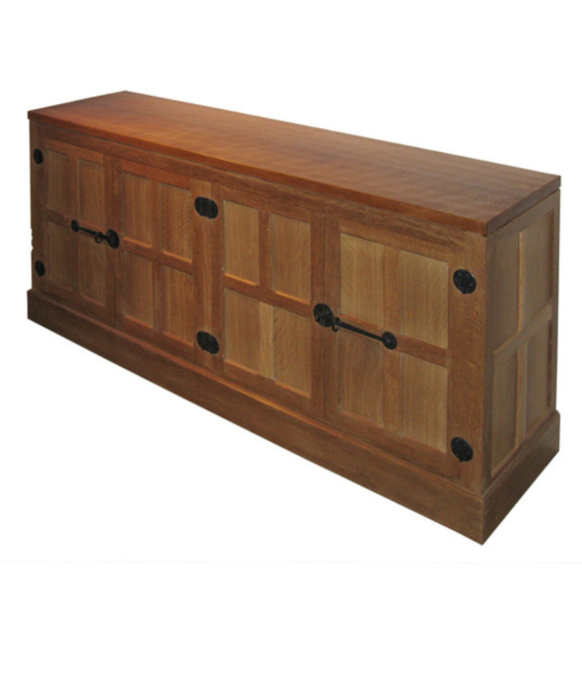 Keep all your entertainment equipment in this spacious unit. It has a rectangular hand adzed top over a pair of double panelled English oak cupboards with internal fixed solid shelves. There is an oak plinth at floor level on three sides.