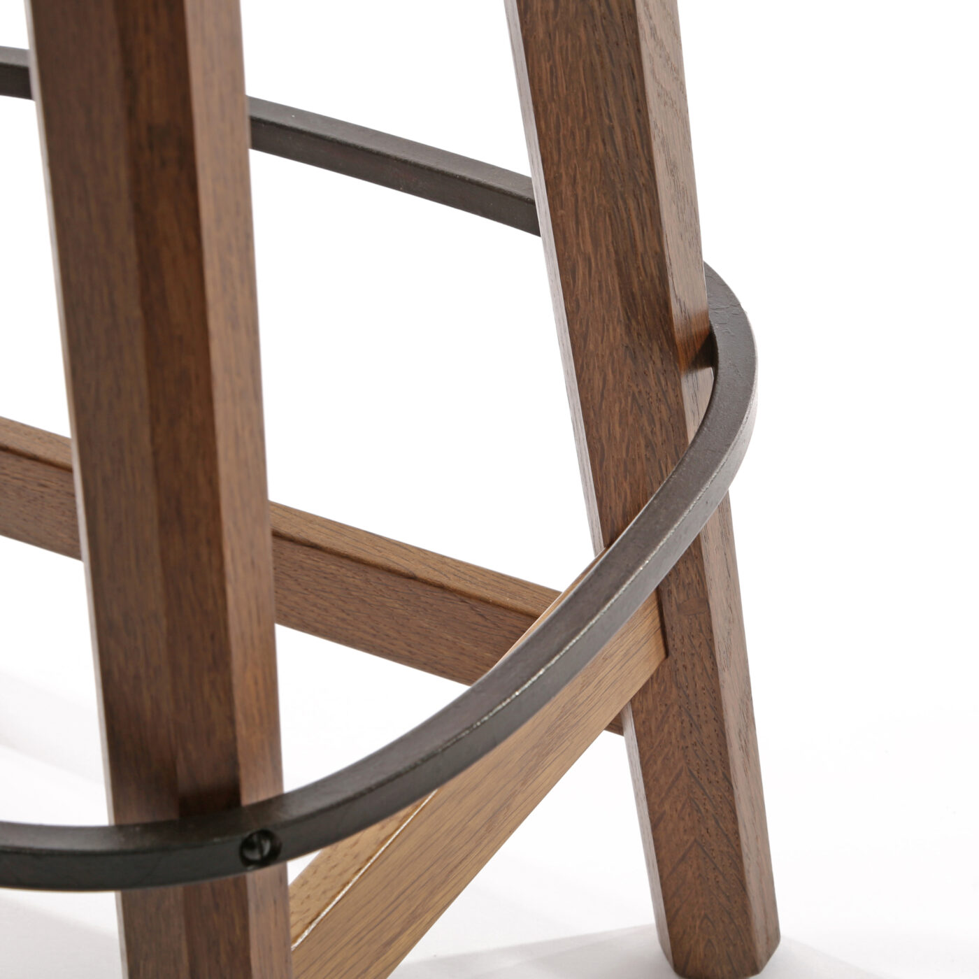 Same as our standard bar stool, but 4½" lower. It has a shaped adzed top on four tapered octagonal legs, with wrap around wrought iron foot rest bar positioned up from the bottom of the legs.