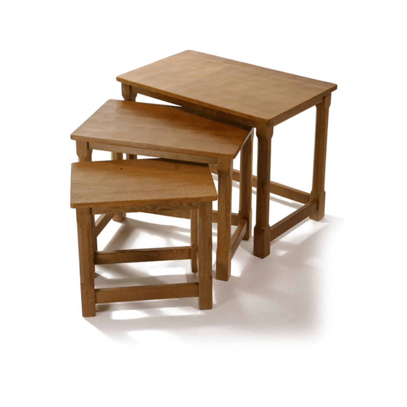 This lovely nest of tables will be a very useful addition to your sitting room. They have rectangular hand adzed tops, supported by four simplistic octagonal legs. The two smaller tables nest below the larger of the three tables. Our hand carved mouse trade mark appears on each of the three tables. * The image shown is for reference only. As each piece is handmade using natural materials, variations in grain and appearance are to be expected and make every item unique.