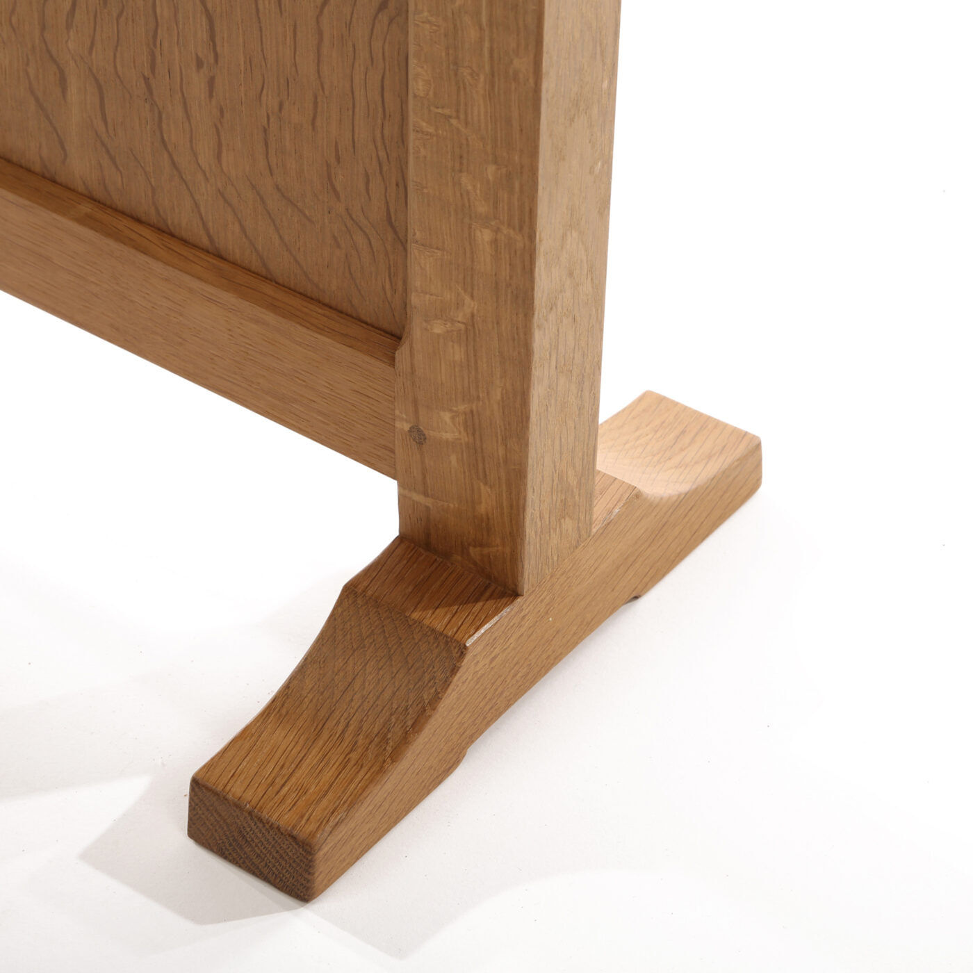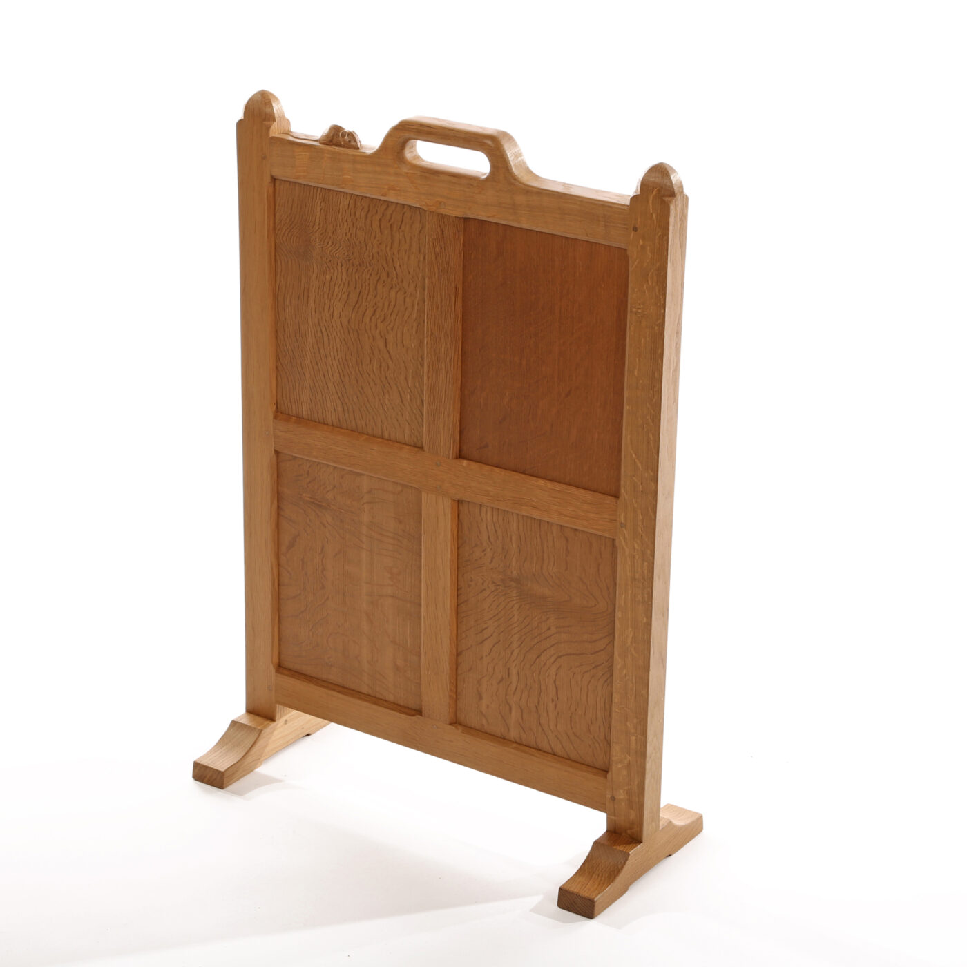 This firescreen will look stunning in front of your fireplace when it is not in use. It has a pierced hand hole and octagonal finial detail at the top of the frame, which houses four solid oak panels ending at floor level with two sledge feet.