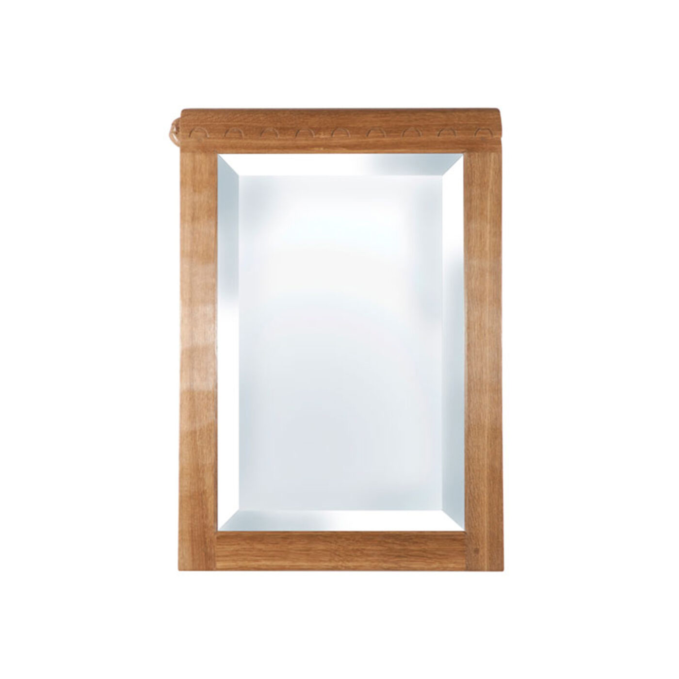 This hand adzed portrait oak frame houses a bevelled edge mirror with a pair of hidden fixing brackets for wall mounting.