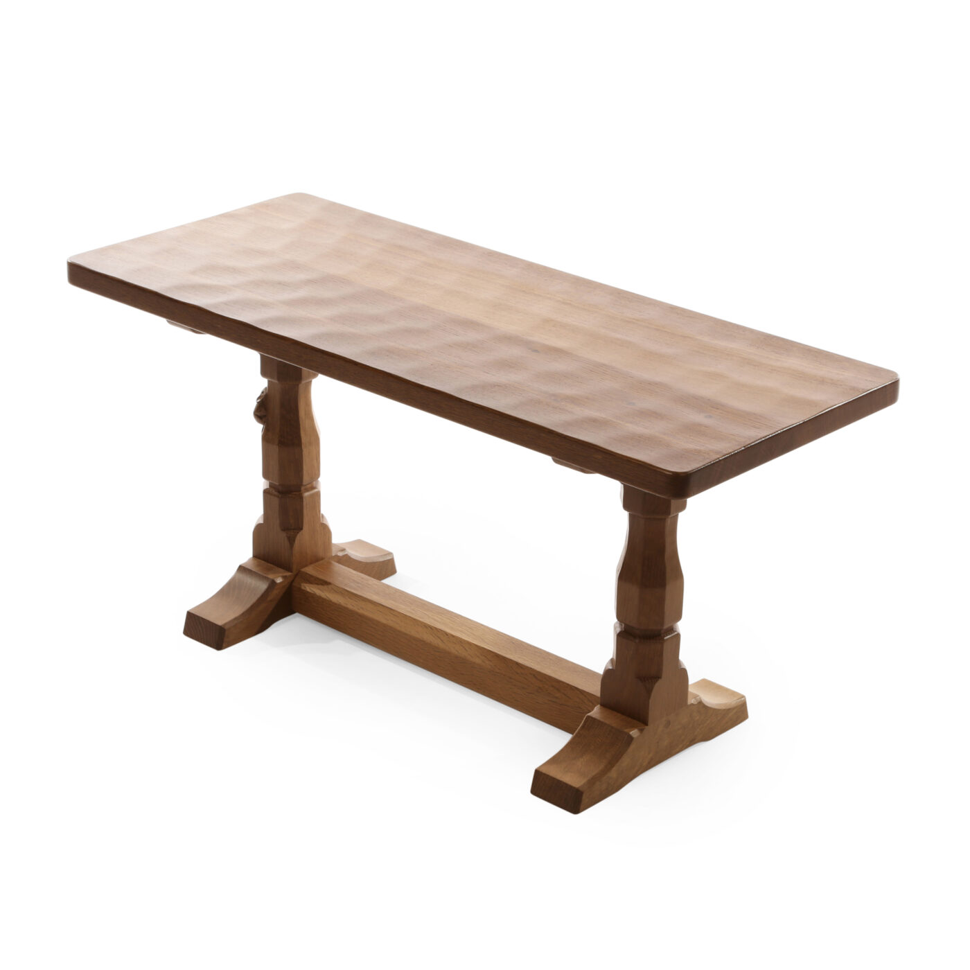 If you have a little less space to play with, this might be the size for you. The rectangular hand adzed top is supported by two carved octagonal legs, joined by a single chamfered stretcher at floor level. * The image shown is for reference only. As each piece is handmade using natural materials, variations in grain and appearance are to be expected and make every item unique.