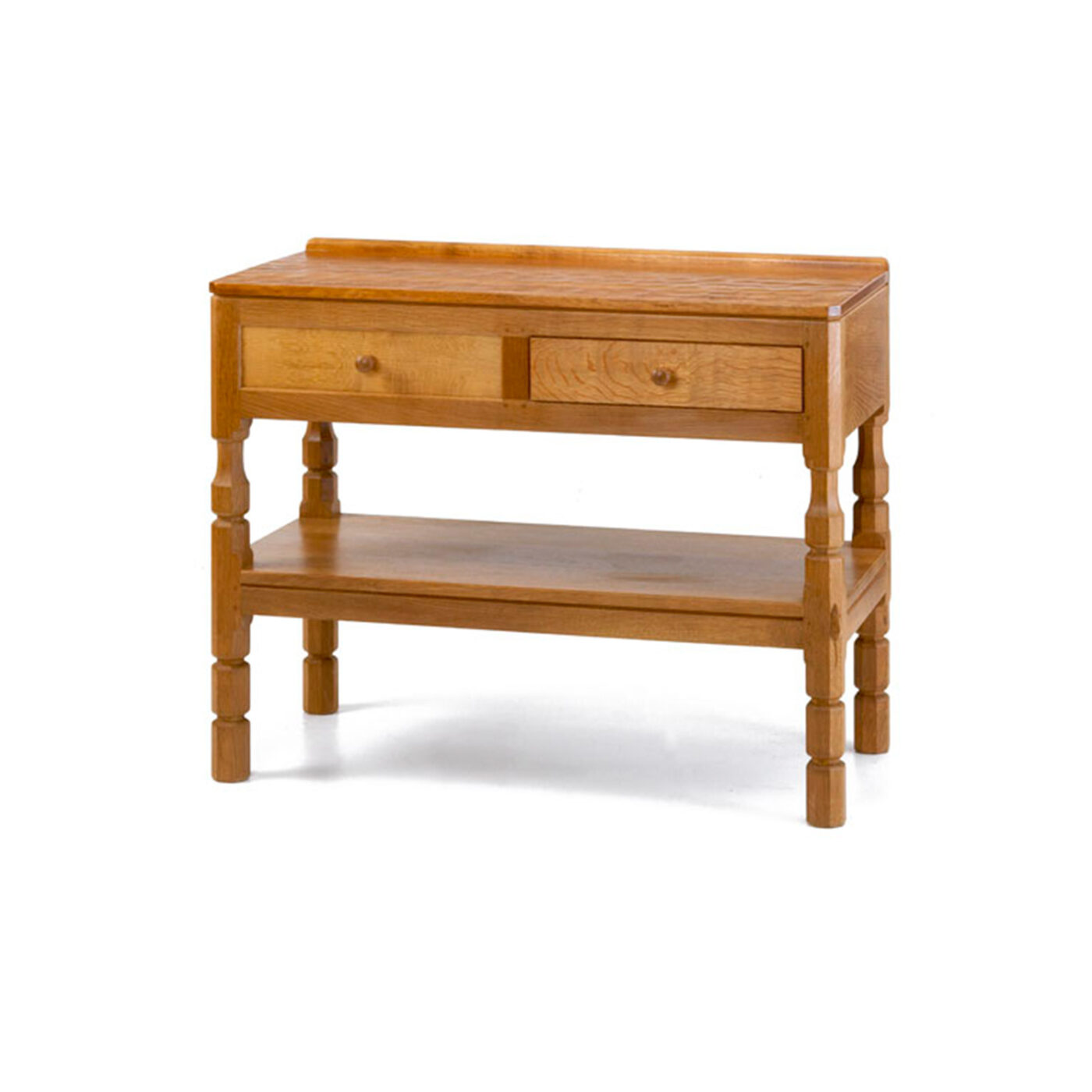This serving table will make dishing up meals a joy! The rectangular hand adzed top has two drawers below (one partitioned out for cutlery) on four carved octagonal legs joined by a full shelf up from the floor.