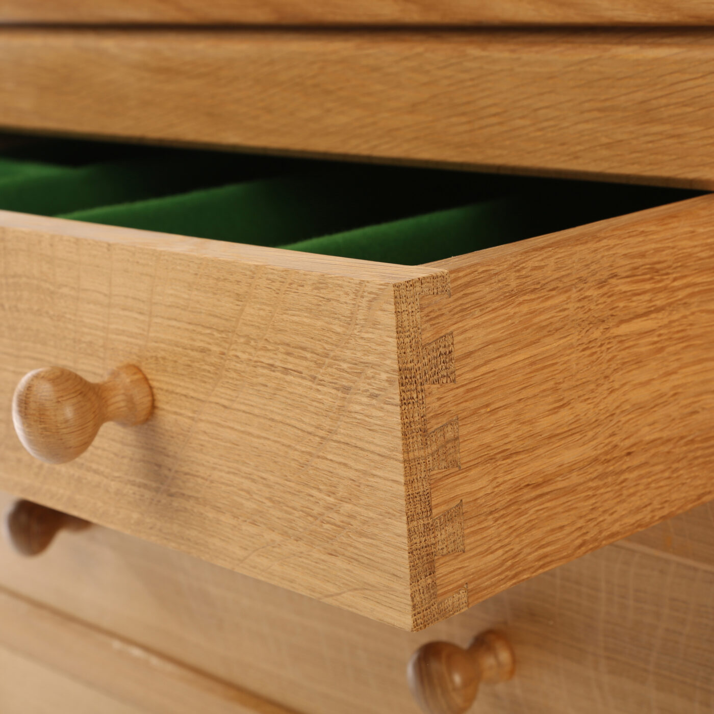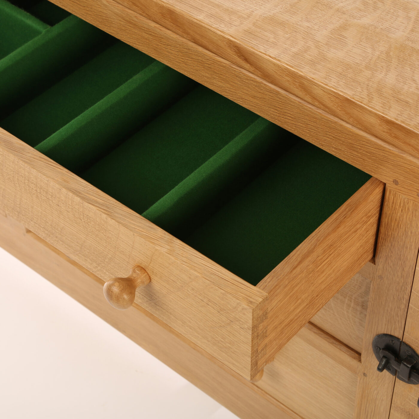 This beautiful English oak sideboard will look stunning in any dining room or kitchen. It has a rectangular hand adzed top with an upstand to the rear over a pair of panelled cupboards, each of which has one internal fixed shelf. These cupboards are divided by a central bank of three graduated drawers, one of which is baize lined for cutlery.