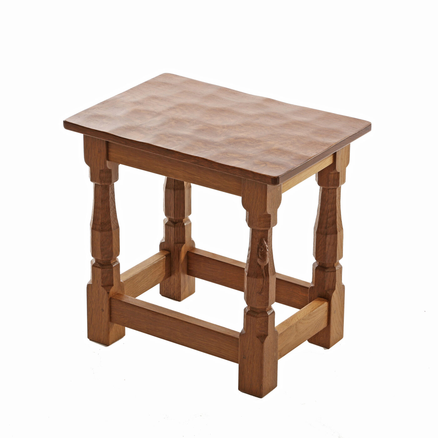 Our well-known range of stools starts with this rectangular hand adzed flat oak top, supported by four carved octagonal legs.