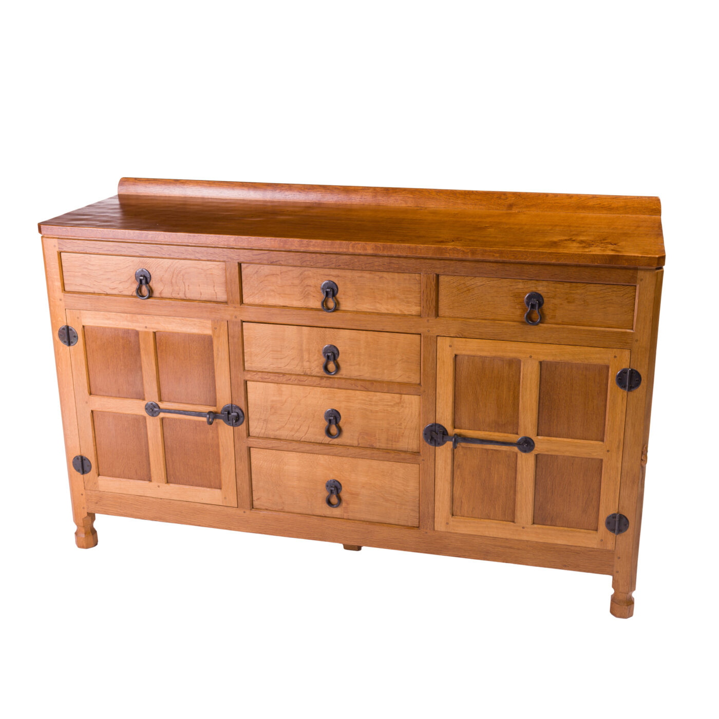 This Classic Mouseman 5 ft Tall Sideboard has a rectangular hand adzed top with an upstand to the rear above three drawers, one for cutlery, over a pair of panelled English oak cupboards with a single fixed internal shelf in each , divided by a central bank of three graduated drawers.