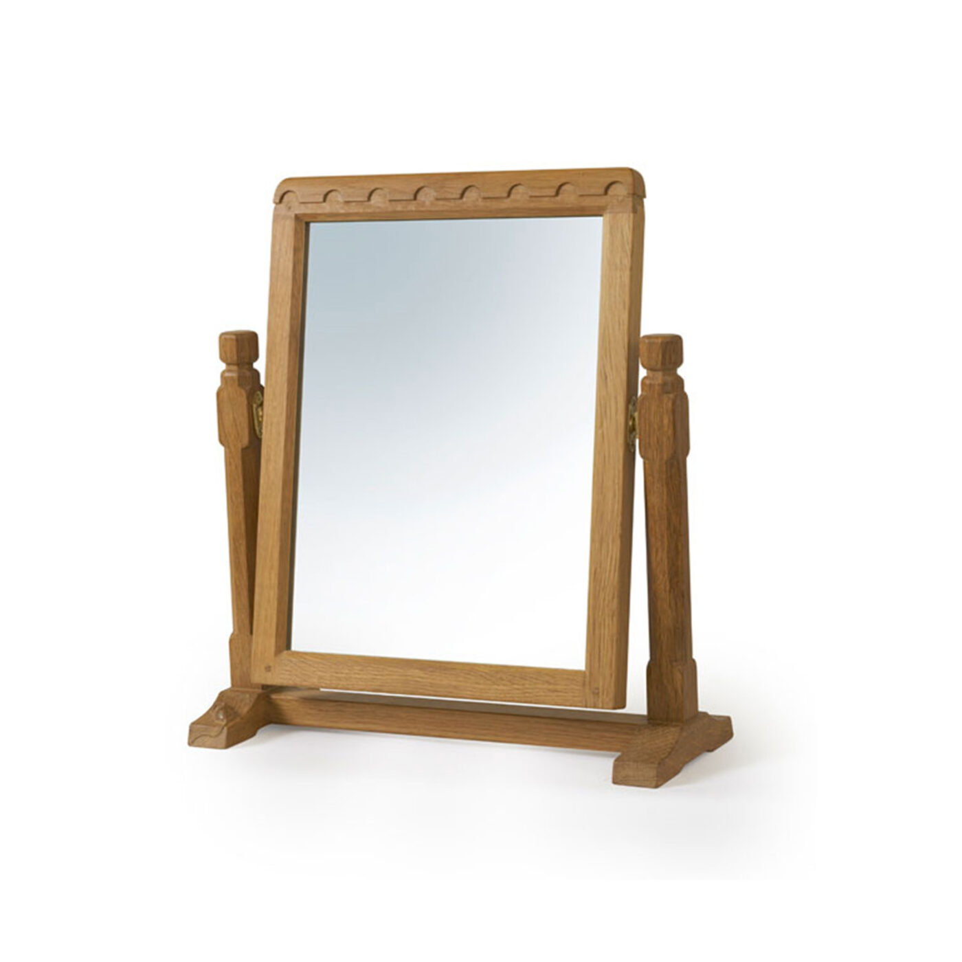 This rectangular mirror pivots on a central axis between a pair of octagonal vertical posts rising up from a low level oak frame.